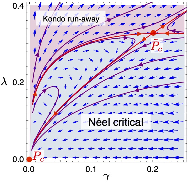 transition between the Néel critical and Kondo run-away regimes. The symmetry breaking at this fixed point results in the