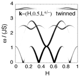 splitting of the magnon bands near the incommensurate low energy peaks as well as near the pi resonance, distinguishing between the