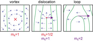 We study the interplay of topological excitations in stripe phases: charge dislocations, charge loops, and spin vortices. In two dimensions