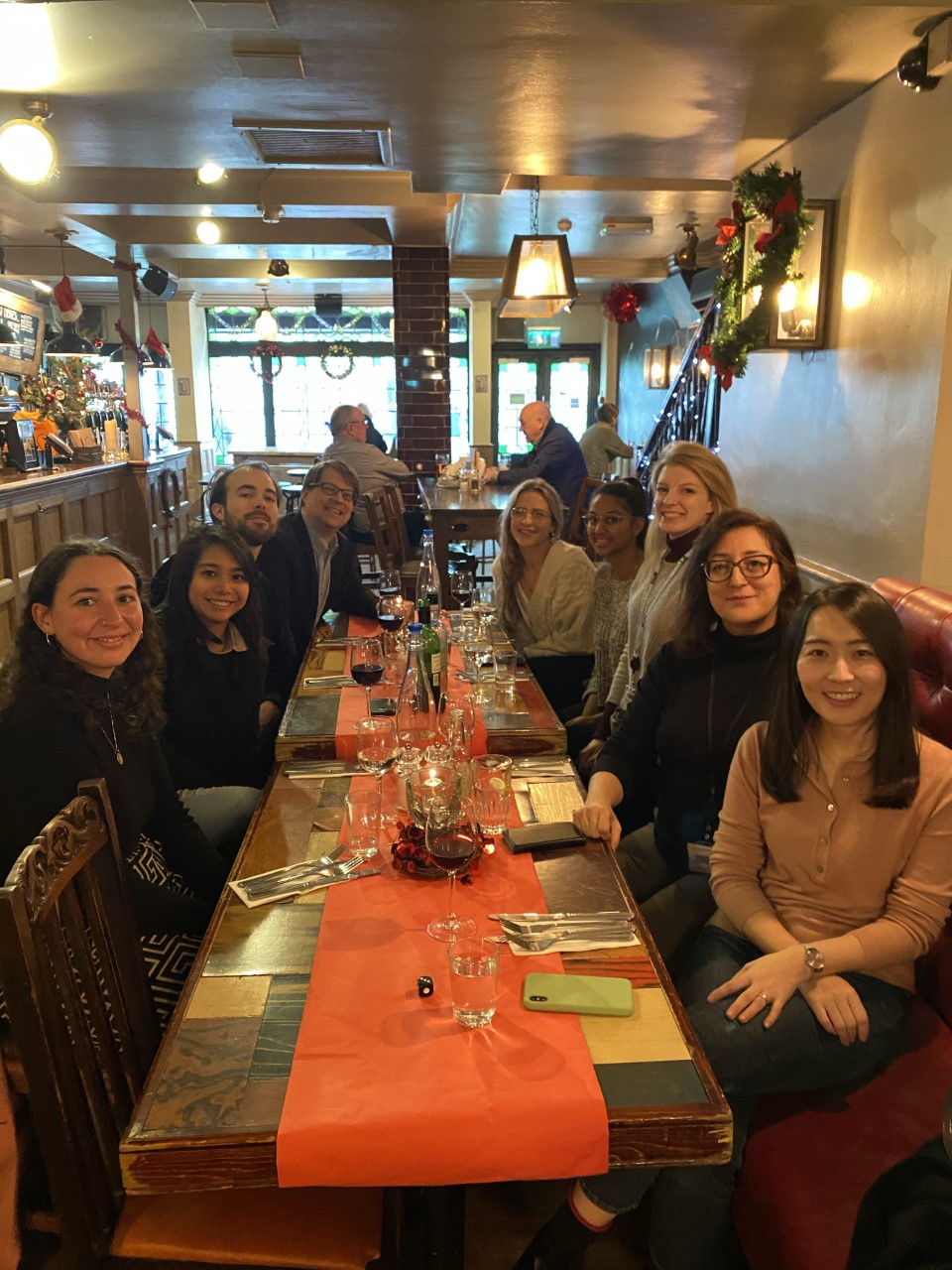 Left, Dr. Rihel speaks at a meeting. Center, End of Year lunch, 2019
