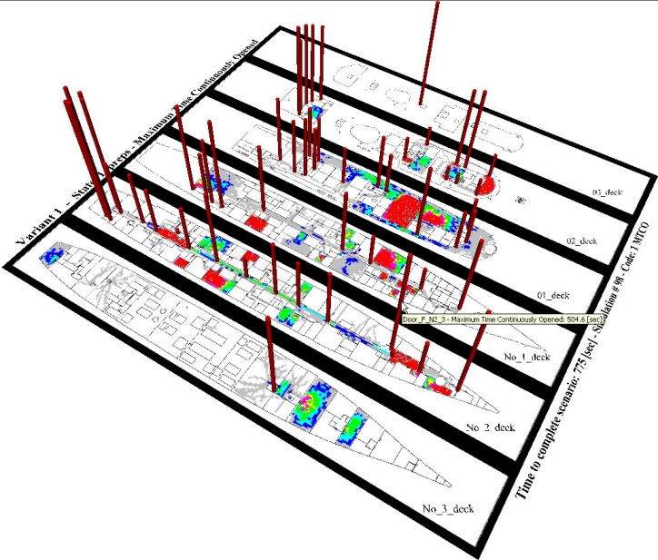 Allthough this work showed that interactive visualisations were possible in PARAMARINE-SURFCON, the resulting file sizes were unweildy for use in the fluid early stages of ship design. An alternative approach of overlaying 2D images and animations over the 3D model was proposed. Subsequent discussions with GRC (the vendor of PARAMARINE-SURFCON) indicated that the time required to make the necessary modifications for this functionality was beyond the scope of the project and so this option was not pursued within PARAMARINE. However, it was possible for UCL to develop a visualisation tool based on the Virtual Reality Modeling Language (VRML). This makes use of a third-party viewer operating within a web browser, and can provide an interactive display with 3D shapes, animated and static texture maps. The tool developed is shown in Figure 6. The footfall density map resulting from a maritimeEXODUS simulation is shown, with vertical bars providing a visual indicator of how long the watertight doors were open.