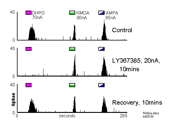 PSTHs showing neuronal responses to DHPG, NMDA and AMPA before, during and after iontophoretic application of LY367385 (For details see Figure 2). Note that this antagonist produced a selective reduction of the responses to DHPG.