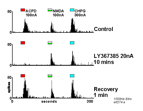 PSTHs showing neuronal responses to ACPD, NMDA and CHPG before, during and after iontophoretic application of LY367385 (For details see Figure 2). Note the selective reduction of the response to ACPD compared to CHPG.