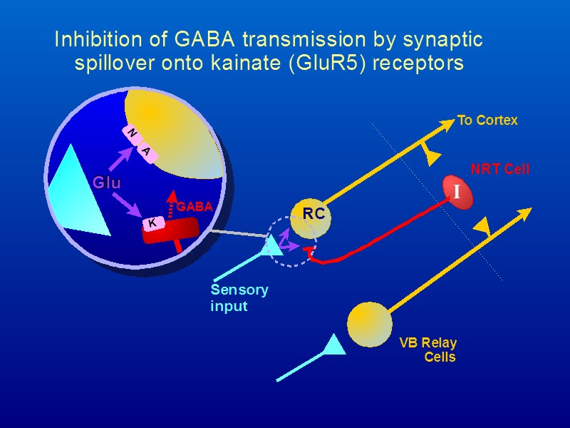 The availability of selective agonists and antagonists for some of the kainate receptors has recently allowed an evaluation of the role of kainate receptors in the thalamus. Based upon a series of in vivo and in vitro experiments, we suggest that kainate receptors are located presynaptically on inhibitory GABAergic terminals of thalamic reticular nucleus neurones, and that these are normally activated by glutamate spillover from synapses between excitatory afferents and relay neurones during physiological stimulation. We propose that this GluR5-activated disinhibition has an important novel role in extracting sensory information from background noise (Binns et.al., 2003).