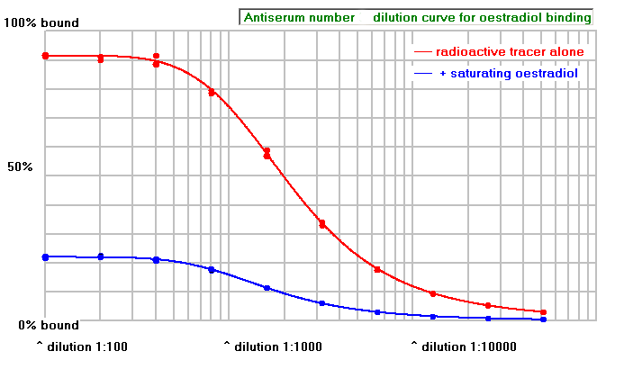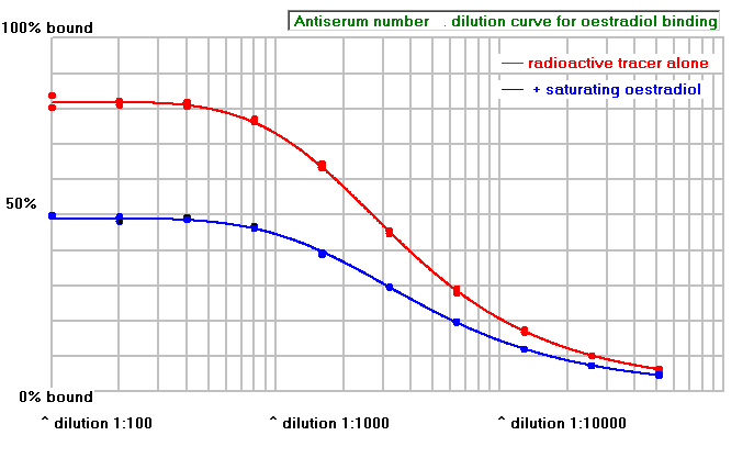 The graph below shows an antiserum that will not be useful. Although again it has an antibody titre around 1:1000, little of the radioactive tracer is displaced by the saturating non-radioactive oestradiol, showing that there is a great deal of non-specific binding.