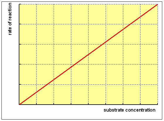 A simple chemical reaction with a single substrate shows a linear relationship between the rate of formation of product and the concentration of substrate, as shown below: