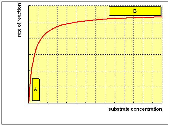 (A) At low concentration of substrate, there is a steep increase in the rate of reaction with increasing substrate concentration. The catalytic site of the enzyme is empty, waiting for substrate to bind, for much of the time, and the rate at which product can be formed is limited by the concentration of substrate which is available.