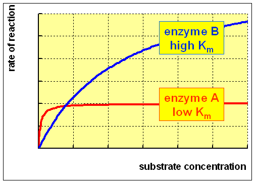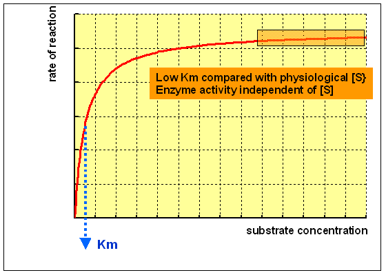 An enzyme with a low Km relative to the physiological concentration of substrate, as shown above, is normally saturated with substrate, and will act at a more or less constant rate, regardless of variations in the concentration of substrate within the physiological range.
