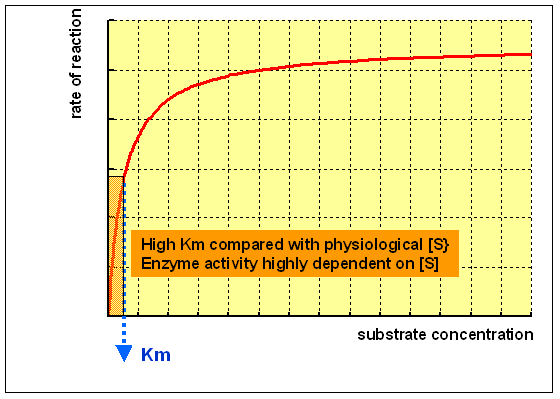 An enzyme with a high Km relative to the physiological concentration of substrate, as shown above, is not normally saturated with substrate, and its activity will vary as the concentration of substrate varies, so that the rate of formation of product will depend on the availability of substrate.