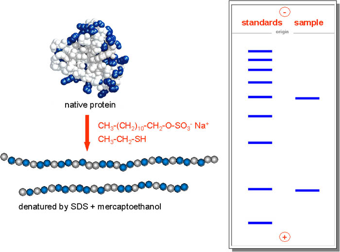 If the protein is denatured with mercaptoethanol (to reduce disulphide bridges to -SH groups) and the anionic detergent sodium dodecyl sulphate (SDS), it becomes coated with a layer of the detergent, and therefore all proteins will have a similar charge. The distance they move on electrophoresis now depends on their size.