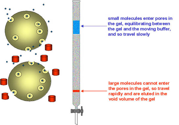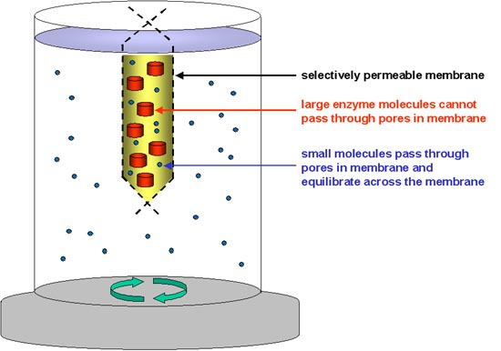 As shown in the diagram, the enzyme solution is placed in a bag of selectively permeable membrane (e.g. cellophane), immersed in a large volume of buffer that is stirred and maintained at about 4C.The membrane has pores that will permit small molecules such as ammonium and sulphate ions to cross, and hence equilibrate in the larger volume of buffer outside, while not permitting large protein molecules to cross. If the buffer is changed several times, allowing several hours each time for the ammonium sulphate to equilibrate, more or less all of it will be removed from the protein solution.