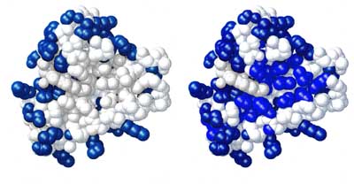 The diagram on the right shows two proteins, with their hydrophilic regions coloured blue.The protein on the left has relatively few hydrophilic regions, and hence will aggregate and precipitate at a relatively low concentration of ammonium sulphate - perhaps around 20 - 30% saturation. By contrast, the protein on the right has considerably more hydrophilic regions, and hence will remain in solution until the concentration of ammonium sulphate is considerably higher - perhaps around 50 - 60% saturation.