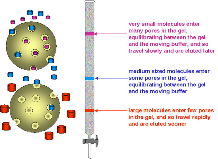 The media used for gel exclusion chromatography include dextran (Sephadex™), polyacrylamide (Bio-Gel P™) and dextran-polyacrylamide (Sephacryl™) and agarose (Sepharose™ and BioGel A™). Each is available with a variety of different ranges of pore size in the beads, permitting separation of macromolecules of different size.