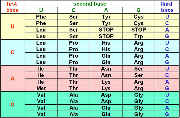 The table shows the genetic code, as in mRNA. Click here to download a printable version.