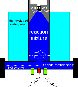 The reaction chamber is separated from the electrodes by a teflon membrane, which permits oxygen to diffuse from the reaction buffer into the potassium chloride solution that bathes the electrodes: a platinum cathode and a silver anode. A voltage is applied between the electrodes and the resulting current (approx. 1 µA) is proportional to the concentration of oxygen.