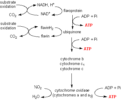 The carriers of the mitochondrial electron transport chain act to transfer the electrons derived from oxidation of substrates down an electrochemical gradient until finally oxygen is reduced to water. At three stages in the re-oxidation of NADH there is phosphorylation of ADP to yield ATP; in the re-oxidation of reduced flavins there are only two steps at which ADP is phosphorylated to ATP.
