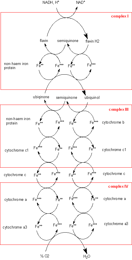 A more detailed view of the arrangement of the carriers in the electron transport chain is shown below - each carrier is reduced by the one above it, and in turn is reoxidised by reducing the carrier below, until finally oxygen is reduced to water. This diagram shows the three complexes of carriers involved in the re-oxidation of NADH; each complex is associated with phosphorylation of ADP to ATP. Complex II is not shown here - it is the reaction of reduced flavins with ubiquinone, which is not associated with phosphorylation of ADP to ATP.