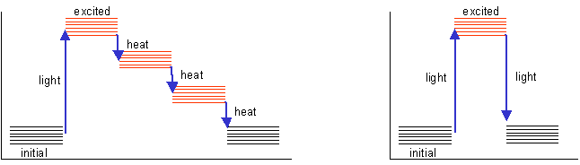 In some compounds, the energy of excitation is lost in a single quantum jump, as light, as shown on the right in the diagram below. Such compounds are said to be fluorescent - if they are excited with light of an appropriate wavelength, they will emit light of a longer wavelength (lower energy).
