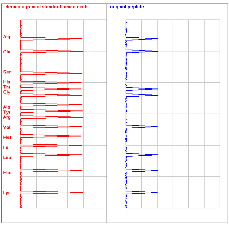 The figure below shows typical traces for a mixture of standard amino acids (left) and a peptide hydrolysate (right), so that it is possible to identify which amino acids are present in the peptide.