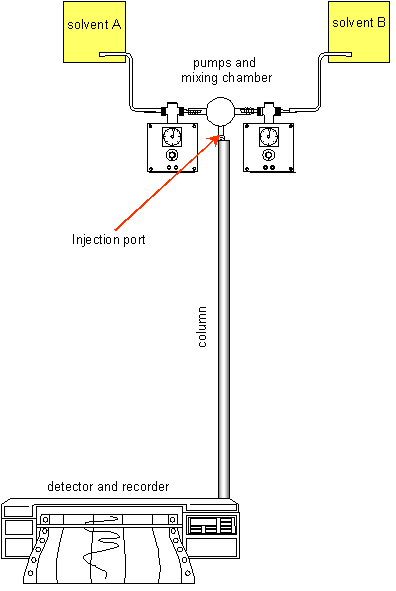 High pressure liquid chromatography (hplc) is an extremely sensitive column method, using very small volumes of sample, and columns that are typically some 150 mm long and 4 - 5 mm in diameter. The stationary phase is in the form of very uniform spheres, typically some 5 µm in diameter, packed into the column. The mobile phase is pumped through the column under high pressure, and 5 - 10 µL of the sample is injected into the system just above the column. Sometimes the mobile phase has a constant composition; at other times its composition is varied though the elution period by mixing two different solutions to provide a gradient of mobile phase composition.
