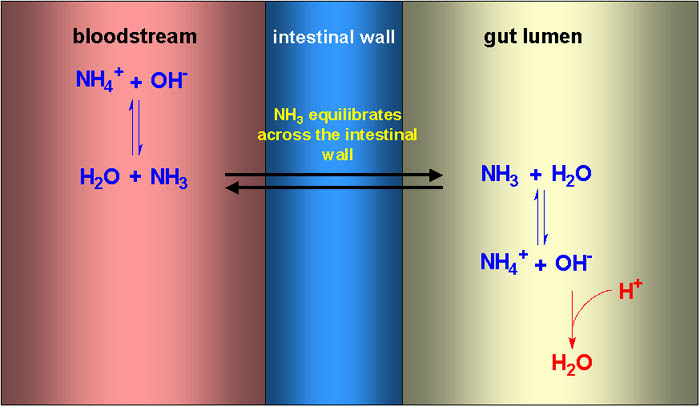Ammonia will cross the intestinal wall, since it is lipid soluble, but ammonium ions cannot. At physiological pH the equilibrium between ammonia and ammonium in the bloodstream is well towards ammonium ions, but there is always a small amount of ammonia. This can diffuse across the intestinal wall into the lumen of the gut. Here the result of fermentation of lactulose to lactate is a significant fall in pH, resulting in a shift of the equilibrium further towards ammonium ions, which cannot cross the intestinal wall. As a result, ammonium ions are trapped in the intestinal lumen, and there is a nett flux of ammonia form the bloodstream into the intestinal lumen.