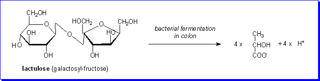 In less critically urgent cases of ammonia intoxication (sometimes in infants, sometimes in adults with liver failure) the treatment of choice is administration of the disaccharide lactulose, either orally or by rectal infusion. Lactulose is a synthetic disaccharide that is not hydrolysed by intestinal enzymes, but (if given orally) passes into the large intestine, where it is a substrate for bacterial fermentation to lactate.