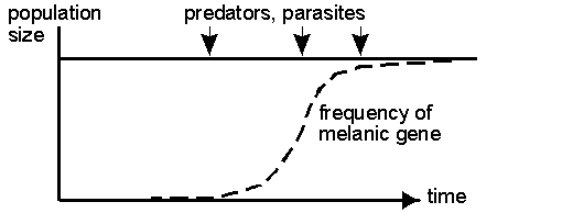 c) Evolution of melanism in an adult moth while caterpillar numbers are strongly regulated by parasites and predators &c. No change in population size (soft selection)