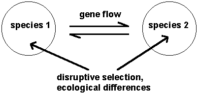 Species within a region are genetically differentiated populations potentially connected by gene flow. This gene flow may be very low (as in the biological species concept), but it doesn’t have to be negligible. The important thing is that the gene flow is low enough, and the disruptive selection keeping the populations apart is strong enough so that genetic differences between the species are maintained. If the two populations collapse together, because the gene flow outweighs selection, then there will only be a single species.
