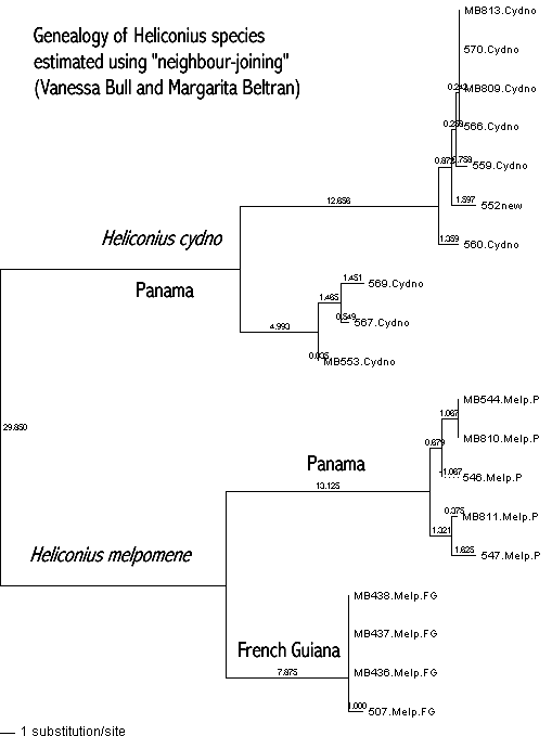 Heliconius cydno and H. melpomene are closely related species which also occasionally hybridize. They clearly fall on separate branches of this genealogy of the genes CO1 and CO2 of mtDNA. However, it is also true that the melpomene from French Guiana falls on a separate branch of the genealogy from the members of the same species from Panama, and there is a similar deep branching pattern even within Panamanian cydno. Thus, a separate genealogy is not a good guide to separate species status. Other geographic races of Heliconius melpomene have mtDNA genealogies that intermingle with the Panamanian H. melpomene, so not all geographic populations have separate genealogies.