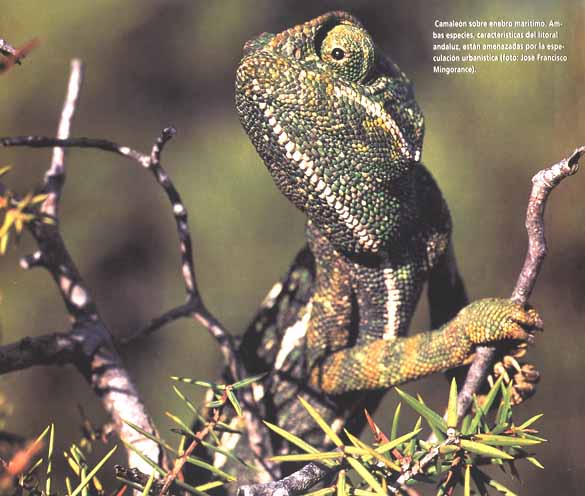 El camaleón y el enebro marítimo se han convertido en todo un símbolo de la conservación de un litoral andaluz cada vez más acosado por la especulación urbanística. La provincia de Cádiz es un buen ejemplo actual de cómo el desarrollo costero insostenible acaba con los últimos reductos de ambas especies amenazadas.