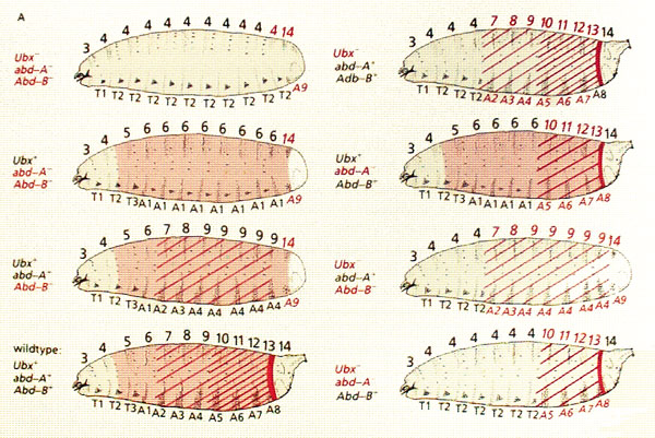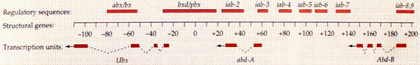 This model, based purely on genetics, was a remarkable achievement and contains the essence of the truth. However, when the BX-C was cloned and analyzed it was found to be wrong in one important respect: there are only three transcription units (protein coding units) not nine or ten as Lewis had proposed. These units are named Ubx, abd-A and Abd-B, in that order along the chromosome. They are expressed in broad overlapping domains in the embryo, Ubx from T3 to A8, abd-A from A2 to A8 and Abd-B from A5 to A8. Note that they are expressed in progressively more posterior domains that correspond to their relative positions along the chromosome. If the Ubx protein coding sequence is deleted, segments A1 and T3 develop as T2 (i.e. the sum of Lewis's mutations bx, pbx and bxd). If abd-A is deleted, then T2-A1 develop more-or less normally (judging by the bristles on the larval cuticle) but A2-A4 develop as A1 (the sum of iab2, 3 and 4). If Abd-B is deleted, T2-A4 develop normally but A5-A8 develop as A4 (the sum of iab5, 6,7 and 8) (see below).
