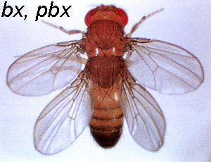 Lewis found that, in general, dominant mutations in the BX-C changed segment identity to that of the next more posterior segment while recessive mutations caused transformations in the opposite direction. For example, the recessive gene bithoraxoid (bxd) causes the first abdominal segment (A1) to take on the character of the third thoracic segment (T3). Since T3 normally carries a pair of legs as well as halteres (balancers), bxd mutants have four pair of legs instead of the normal three, as well as two pairs of halteres. Other recessive BX-C genes are bithorax (bx), mutations of which convert the anterior half of T3 to the anterior half of T2 (i.e. T3a -> T2a), postbithorax (pbx) which converts the posterior half of T3 to the posterior half of T2 (T3p ->T2p). Thus, the double recessive mutant (bx, pbx) carries two pairs of wings.