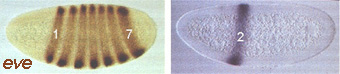 The lower part of this diagram shows part of the regulatory region of the eve gene - the part closest to the transcription start site (red arrow). In this region there are three enhancer elements that control eve expression in stripes 2, 3 and 7. Other elements, not shown in the diagram, lie further away from the transcription start site (to the left) and control eve expression in stripes 1,4,5 and 6. Taking just one of the elements, that for stripe 2, and linking it to a reporter gene gives the pattern shown above right- stripe 2 only. The wild-type eve expression pattern is shown above left. (From Gilbert, Developmental Biology 4th edition Chapter 15, p549 and Alberts et al. Molecular Biology of the Cell 3rd edition, Chapter 9 p428)