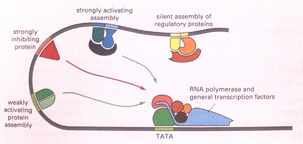 We can think of the activating function of enhancers as follows. Binding of RNA polymerase and the basal transcriptional machinery at the gene promoter is like switching on the engine and allowing it to idle in neutral. When the supplementary transcription factors bound to enhancer elements interact with the basal machinery, it is like putting the engine into gear and pulling away from the kerb. (Alternatively, for a repressor site it is like putting on the handbrake.)