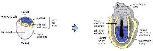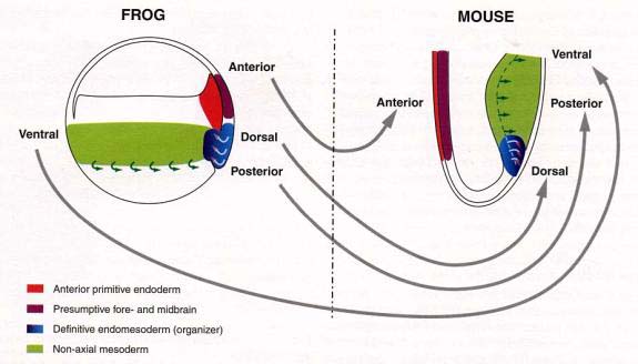 Around mid-gastrulation the mouse embryo can be imagined as as being a Xenopus embryo which has been split open just anterior to the dorsal blastopore lip and turned inside out (see diagram).