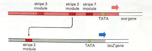 Frequently, a given gene is subject to complex regulation. That is, it might have to be transcribed at different times and in different places during development, or in response to different extracellular stimuli. In the present context (Drosophila embryogenesis) we have seen that the segmentation genes are expressed according to their position in the embryo. An example is the even-skipped (eve) gene, a pair-rule gene that is transcribed in alternate embryonic parasegments to generate a zebra pattern of seven stripes. The transcriptional state of the eve gene - either ON or OFF according to which parasegment we are in - is under the control of a series of enhancer elements, one for each stripe. Each enhancer element contains binding sites for upstream segmentation gene products such as Bicoid and Kruppel (which, as you will recall, are themselves transcription factors). Thus the particular constellation of maternal effect genes, gap genes and other pair-rule genes that is expressed in a given parasegment determines whether or not one of the enhancer elements is fully occupied and consequently whether eve gene transcription is activated or not in that parasegment. The specificity of the enhancers can be demonstrated by removing just one of them (the element that specifies stripe 2, say) and inserting it upstream of a reporter gene like the bacterial beta-galactosidase (Bgal). when this is introduced into the embryo, Bgal is expressed in just one stripe - in the position of the eve stripe 2. Alternatively, particular enhancer elements can be deleted from the normal eve gene, resulting in deletion of the corresponding stripes of eve expression. Such a mutation - loss of an enhancer element - is called a regulatory mutation. It affects the spatial or temporal regulation of the gene without causing universal loss of the gene product.