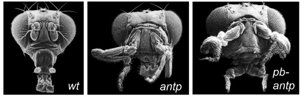 Adult fly heads: wild type, antennapedia (antennae transformed to 2nd thoracic legs) and a double mutant proboscipedia/ antennapedia (antennae to 2nd thoracic and proboscis to 1st thoracic legs). Note how "clean" the transformations are ie transformation of one head structure does not much affect adjacent structures. This illustrates how each structure is developmentally isolated from its neighbours - the fly is put together like a construction toy with interchangeable parts.