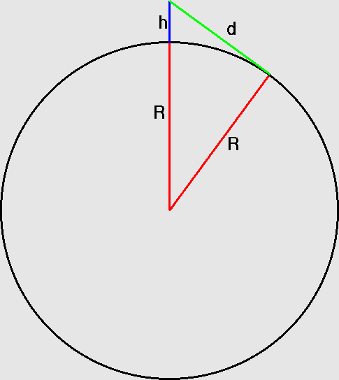 R^2 + d^2 = (R+h)^2which we can solve for d. (Note: ^ denotes "raised to power of".)
