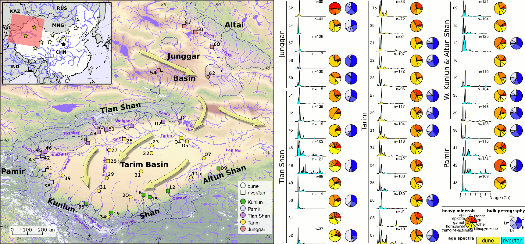 The internal drainage system of the Tarim Basin, fed by a mountainous fringe, provides an excellent opportunity to study sediment pathways, to discriminate the roles of water and wind transport, and to understand the extent to which contributing source area signatures are preserved or mixed in this arid environment. The sampling locations (fig. 1) were chosen so as to cover the Taklamakan and the main catchments and alluvial fans draining the surrounding mountains. Samples from the Junggar Basin were collected for comparison only, without attempt to cover this region comprehensively. Dune samples were taken at the dune crest, in locations upwind away from any anthropogenic features. River sediments were taken from recently deposited, unaltered sand bars, sampled as far as possible across several laminae of internal cross-bedding to reduce hydraulic-sorting bias. A similar strategy was attempted on tributary fans where feasible, by digging into the subsurface and avoiding the blown-out sediment surface. To define provenance signatures, we characterised samples in terms of their bulk petrography (PT), heavy mineral composition (HM), and detrital zircon U-Pb age (dZ) distribution (fig. 1). A PT sample comprises 400 point counts, a HM sample 200 point counts, and a dZ sample ∼150 individual single grain measurements (yielding ∼100–120 concordant ages). For detailed methodology, please see supplemental material.