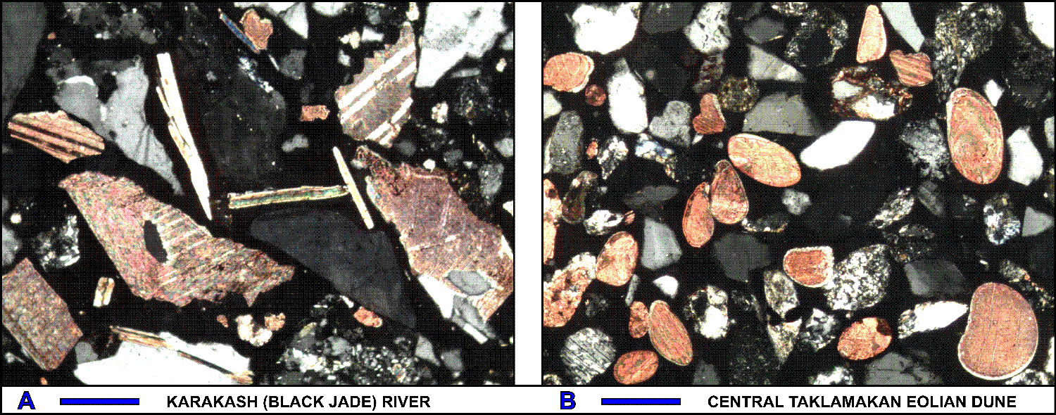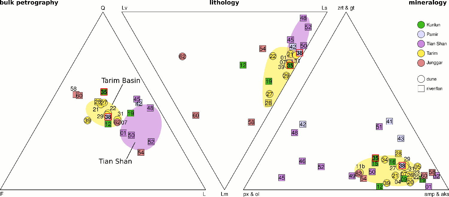 The petrographic compositions of Yarkan River sands (sample 38; fig. 1) in the southwestern part of the basin are indistinguishable from Tarim dune sands. Both share feldspatho-quartzo-lithic to litho-feldspatho-quartzose compositions and contain the same common sedimentary (limestone, shale, dolostone, siltstone / sandstone) and very low grade to high grade metamorphic rock fragments (metapsammite, metapelite). Heavy mineral suites are also similar, dominated invariably by amphiboles (dominantly blue-green hornblende) with associated epidote-group minerals (dominantly pistacite) and significant amounts of pyroxenes and garnet.