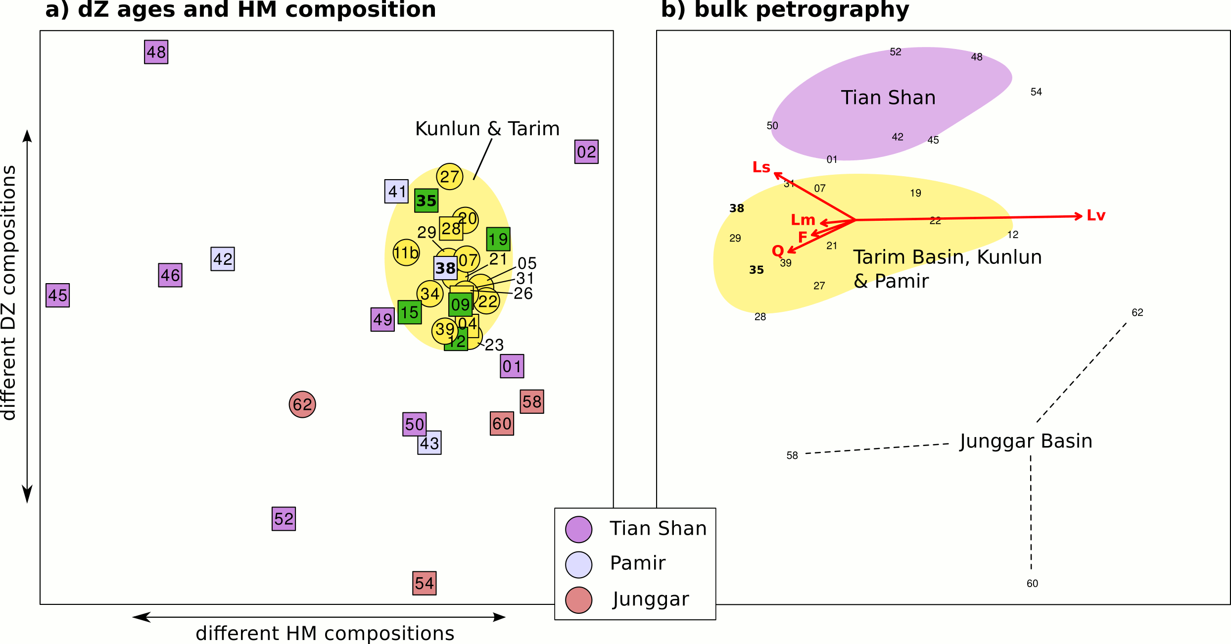 The PCA loadings of the petrographic data (fig. 3b) show that a) most of the variability, and hence, most of the PT provenance information, is carried by the volcanic and sedimentary rock fragments and the quartz content (longest arrows), and b) there exists an anti-correlation between the proportions of volcanic and sedimentary rock fragments (arrows point in opposite directions), which is independent of the quartz component. In this plot, the Tian Shan can be clearly seen as characterised by a higher content of sedimentary and volcanic lithics than the bulk of the Tarim Basin and Kunlun Shan samples, whereas the (Altai-derived) Junggar Basin contains more volcanic lithics and quartz, without input from sedimentary sources.