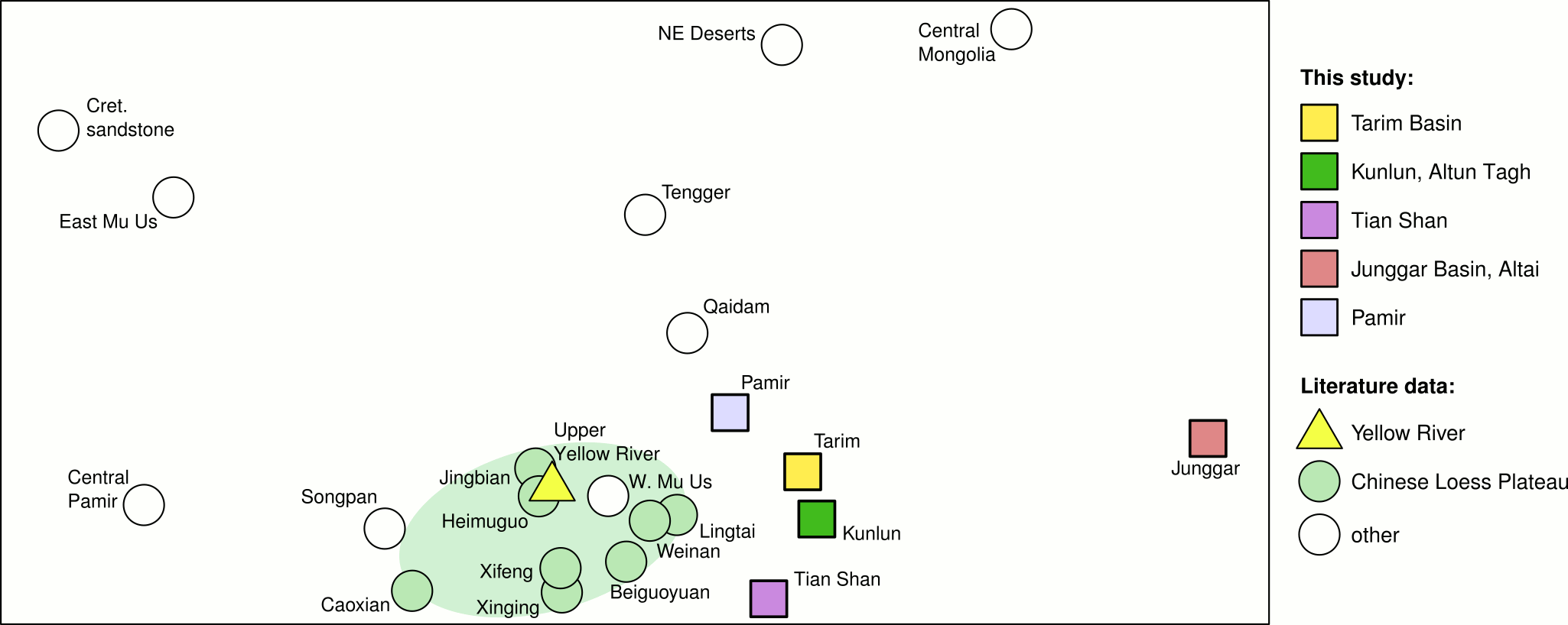 - Northern and northwestern sources from the Tian Shan can be clearly distinguished and contribute only small amounts of sediment to the desert.