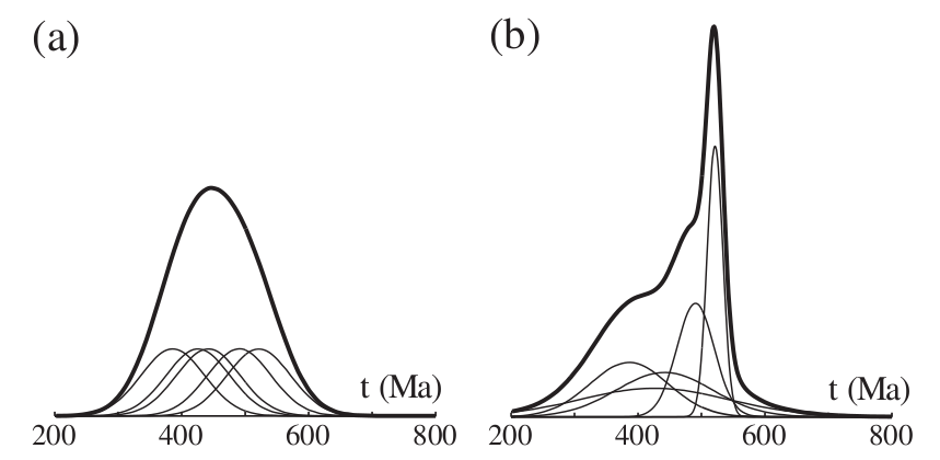 2.2. Probability Density PlotsKDEs are commonly used in many branches of Science, but not in the context of detrital geochronology. Instead, a similar-looking, but fundamentally different tool named ‘Probability Density Plot’ (PDP, Ludwig, 2003, also called Probability Density Distribution by Sircombe, 2004), has gained significant popularity. The PDP was first proposed by Hurford et al. (1984), in an attempt to account for the variable analytical precision (a.k.a. ‘heteroscedasticity’) of (detrital fission track) data. Just like the KDE, the PDP is also produced by stacking a Normal distribution on top of each measurement whose bandwidth, however, is not determined by the density, but by the analytical precision (Figure 1.b), so as to reduce the importance of imprecise measurements and to emphasize the precise measurements. Although this may seem like a sensible strategy at first glance, it may actually degrade results in certain situations, as illustrated with the following two synthetic examples.
