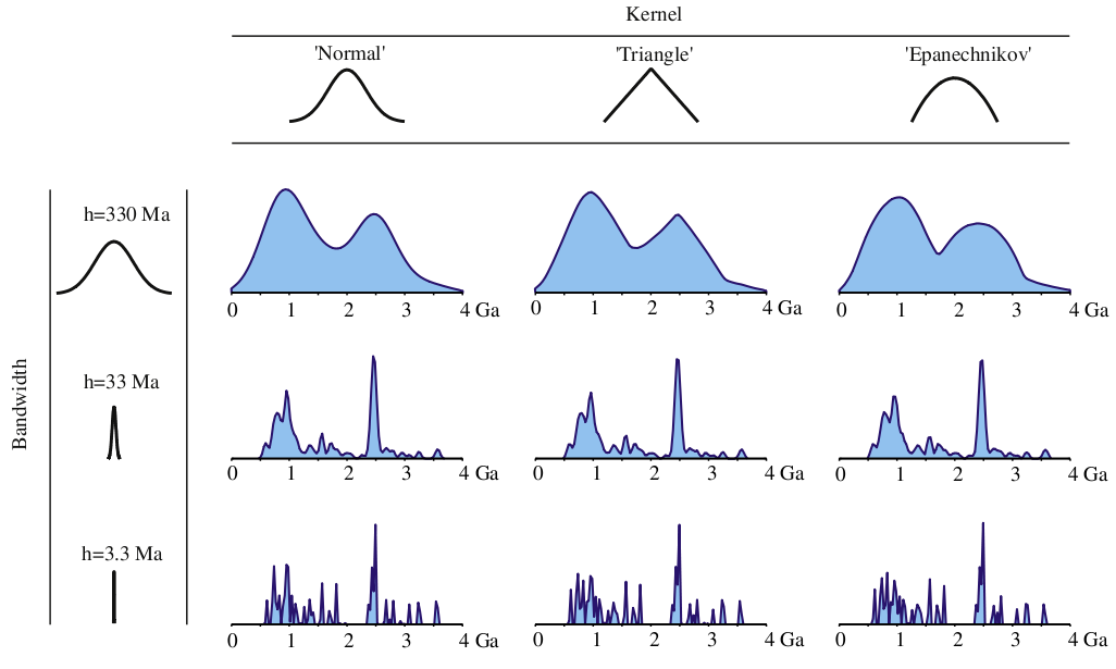 where σ is the standard deviation of the data set. Most detrital age distributions, however, are not smooth or unimodal, and Equation 6 is therefore rarely appropriate, yielding oversmoothed density estimates. Adaptive kernel density estimates vary the bandwidth according to the local density. This means that in areas where data density is sparse, a large bandwidth is used, and the density estimate is smooth. But where lots of data are available, a narrower bandwidth is used, allowing the KDE to provide a high resolution estimate in those parts of the distribution. A large number of methods are available for the selection of the adaptive bandwidth. These include ‘balloon estimators’ (Loftsgaarden and Quesenberry, 1965), in which the bandwidth is made proportional to the density at the evaluation point (‘x’ in Equation 2), and ‘sample-point estimators’ (Breiman et al., 1977), which vary the bandwidth based on the data points (‘xi’ in Equation 2).