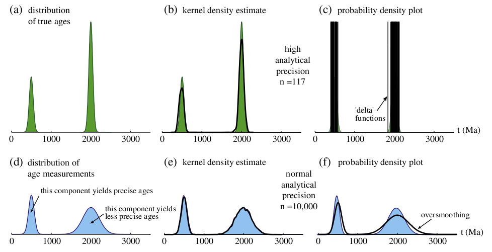 In contrast with the geochronology of igneous and metamorphic rocks, in which one seeks to date an individual geological event, detrital studies generally aim to characterise an entire population of ages by means of a large number of single grain analyses. In statistical terms, the goal of such studies is to estimate the so-called Probability Density Function (PDF), which gives the relative likelihood of the different ages in the population. By definition, the probability for a randomly selected grain to fall within a given range is then given by the integral of the PDF over this range: