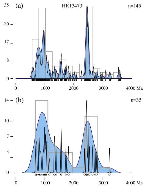 To address the technical and methodological issues arising from the increased popularity of the technique, a detrital zircon geochronology workshop was held immediately prior to the 2011 Goldschmidt conference in Prague. During this workshop, a concensus was reached that the statistical tools used by the community to analyse the vast amounts of U-Pb data produced by today’s SIMS and LA-ICP-MS laboratories are inadequate. Particularly the use of so-called Probability Density Plots (PDPs), which are ubiquitous in the detrital zircon geochronology literature, was identified as a cause for concern. It was noted that, in spite of its name, the PDP lacks any theoretical basis as a probability density estimator, although some maintained that it may still serve a purpose as a data visualisation tool. Galbraith (1998, 2010) eloquently pointed out some problems with the PDP in the context of fission track and luminescence dating, but unfortunately this work was published in specialised journals and has not been picked up by the detrital zircon U-Pb dating community. Furthermore, Galbraith (1990)’s alternative for the PDP, the so-called radial plot, is not ideally suited for displaying large datasets of relatively precise zircon U-Pb ages. This paper proposes the Kernel Density Estimator (KDE), which has a similar appearance as the PDP, but is built on solid theoretical foundations, as a statistically more robust alternative to the PDP (Section 2). In order to aid in the adoption of this method by the detrital zircon U-Pb dating community, a Java-based data visualisation tool called DensityPlotter was developed for plotting detrital age distributions (Section 3).