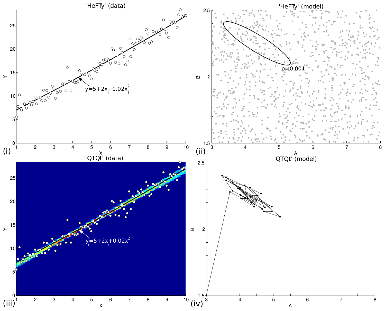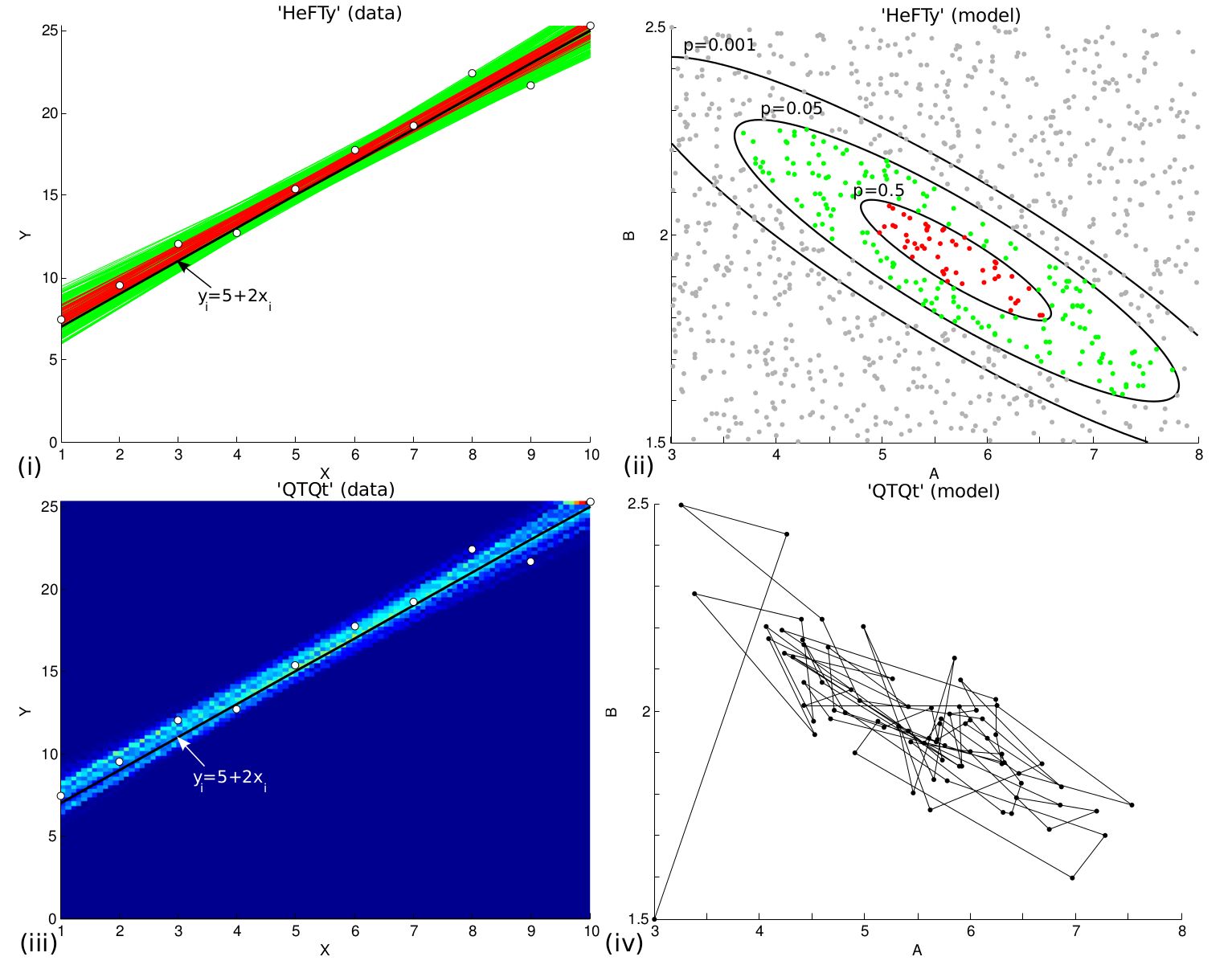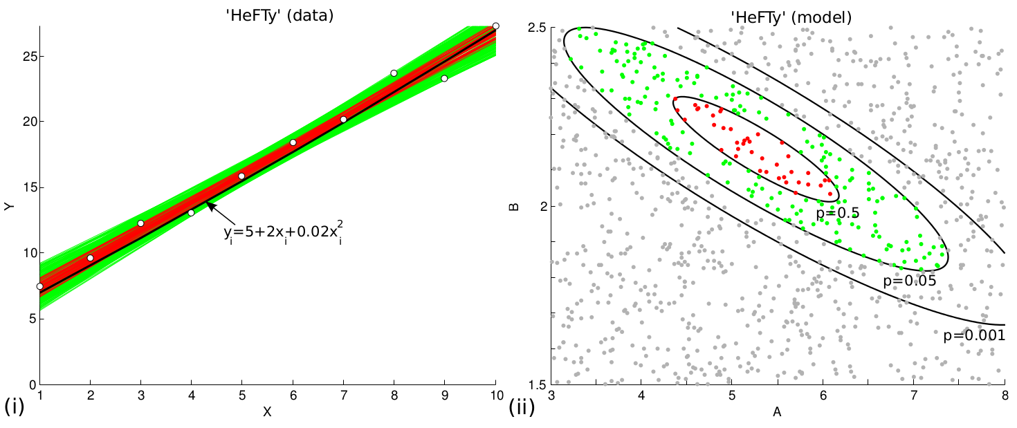 (9). ‘HeFTy’ explores the ‘model space’ by generating a large number (N) of independent random intercepts and slopes (Aj,Bj for j=1→N), drawn from a joint uniform distribution (Figure 2(ii)). Each of these pairs corresponds to a straight line model, resulting in a set of residuals (yi - Aj - Bj xi) which can be combined into a least-squares goodness-of-fit statistic: