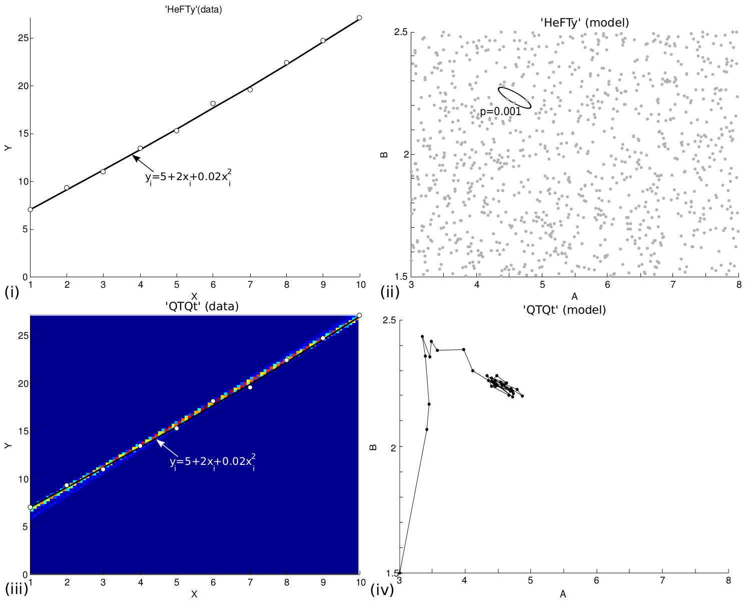 QTQt also explores the ‘model space’ by random sampling, but it goes about this in a very different way than HeFTy. Instead of ‘carpet bombing’ the parameter space with uniformly distributed independent values, QTQt performs a random walk of serially dependent random values. Starting from a random guess anywhere in the parameter space, this ‘Markov Chain’ of random models systematically samples the model space so that models with high P(x,y|Aj,Bj) are more likely to be accepted than those with low values. Thus, QTQt bases the decision whether or not to accept or reject the jth model not on the absolute value of P(x,y|Aj,Bj), but on the ratio of P(x,y|Aj,Bj) / P(x,y|Aj-1,Bj-1). See Appendix B for further details about Markov Chain Monte Carlo (MCMC) modelling. The important thing to note at this point is that in well behaved systems like our linear dataset, QTQt’s MCMC approach yields identical results to HeFTy’s Frequentist algorithm (Figure 2(ii)-(iv)). 2.2 Linear regression of weakly non-linear dataThe physical models which geologists use to describe the diffusion of helium or the annealing of fission tracks are but