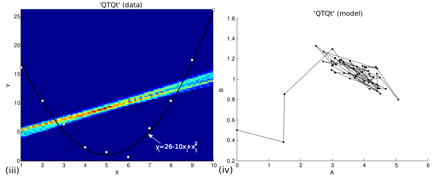 Figure 6: (i) – white circles show 10 data points drawn from a strongly non-linear model (black line). (ii)