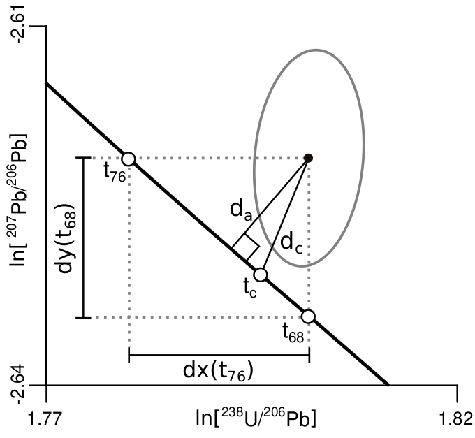 To address this issue, it is useful to subject the U–Pb isotopic ratio data to a logarithmic transformation. So instead of analysing the data on a conventional Tera-Wasserburg concordia diagram, all calculations can be done in ln(207Pb/206Pb) vs. ln(238U/206Pb) space. The advantage of this transformation is that it produces values that are free to range from -∞ to +∞. Within this infinite dataspace, the Euclidean distance metric can be safely applied.